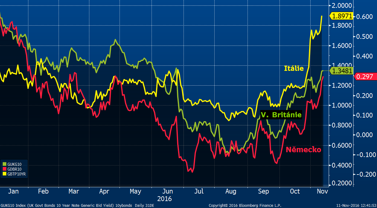 Výnosy dluhopisů rostou (ceny klesají) i na starém kontinentě, italské dluhopisy se nyní obchodují s výnosem 1,9 %, nejvíce od září minulého roku.