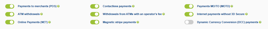 In the payment card settings, you can also block individual types of transactions such as ATM withdrawals in general, payments at terminals, internet transactions, payments from specific countries or at a specific merchant, etc.