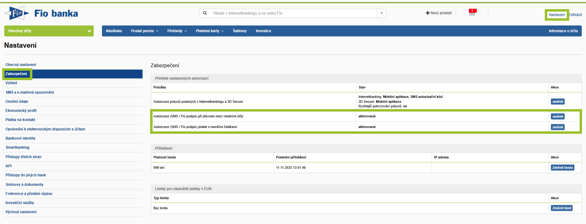 Samozřejmě, že je možné toto nastavení vypnout. Můžete tak učinit v Nastavení v Internetbankingu, v záložce Zabezpečení. Ve vašem případě vidíte ve sloupci stav "deaktivovaná", klikněte na "změnit" a požadavek potvrďte stisknutím tlačítka Odeslat. Tento pokyn nemusíte autorizovat.