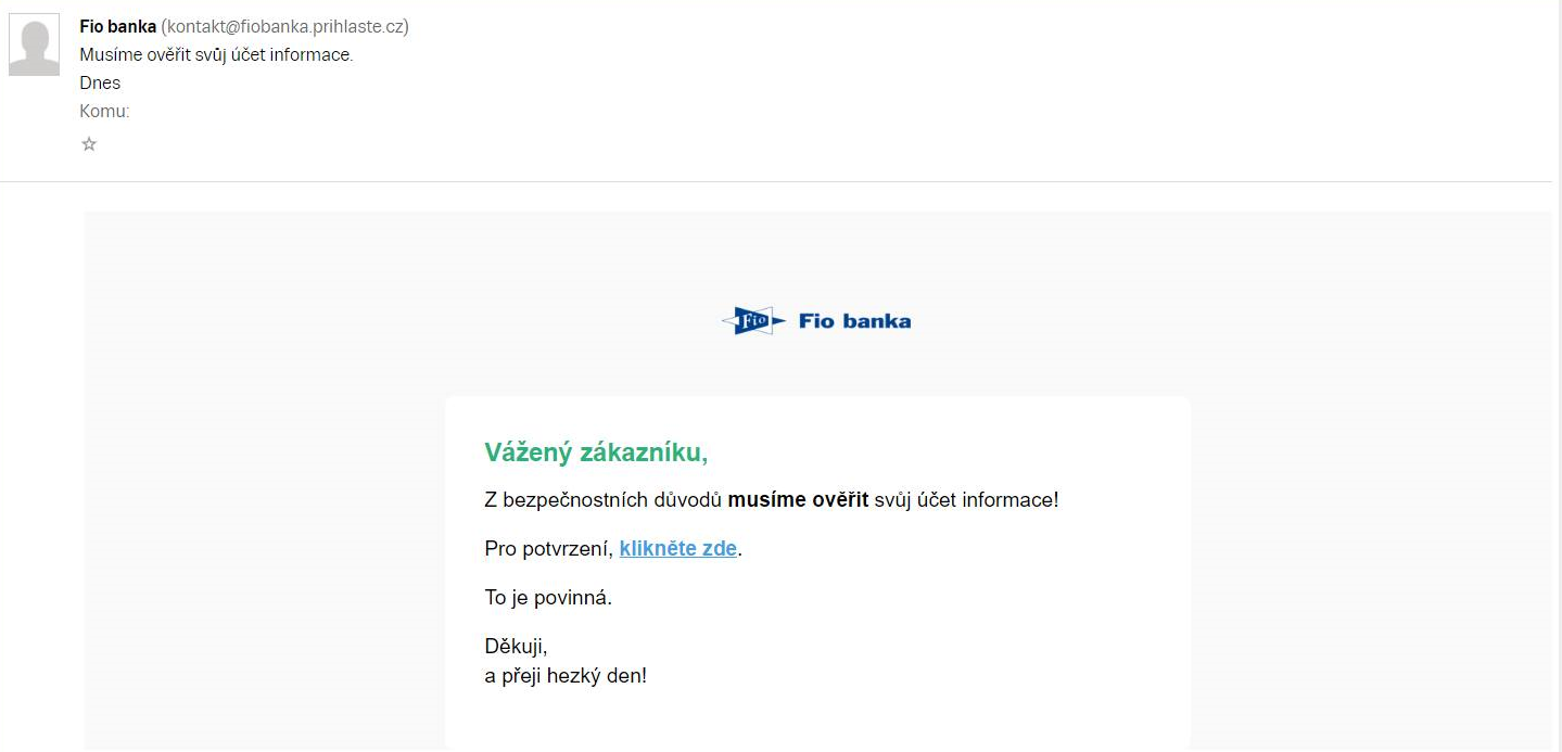 Během dnešního rána jsme zaznamenali podvodné e-maily, které se vydávají za zprávy od nás. Podvodníci se tak snaží získat přihlašovací údaje do internetového bankovnictví. Žádné takové e-maily neposíláme. Pokud Vám takový e-mail přišel, na nic neklikejte a jednoduše ho smažte. Na zablokování již pracujeme.