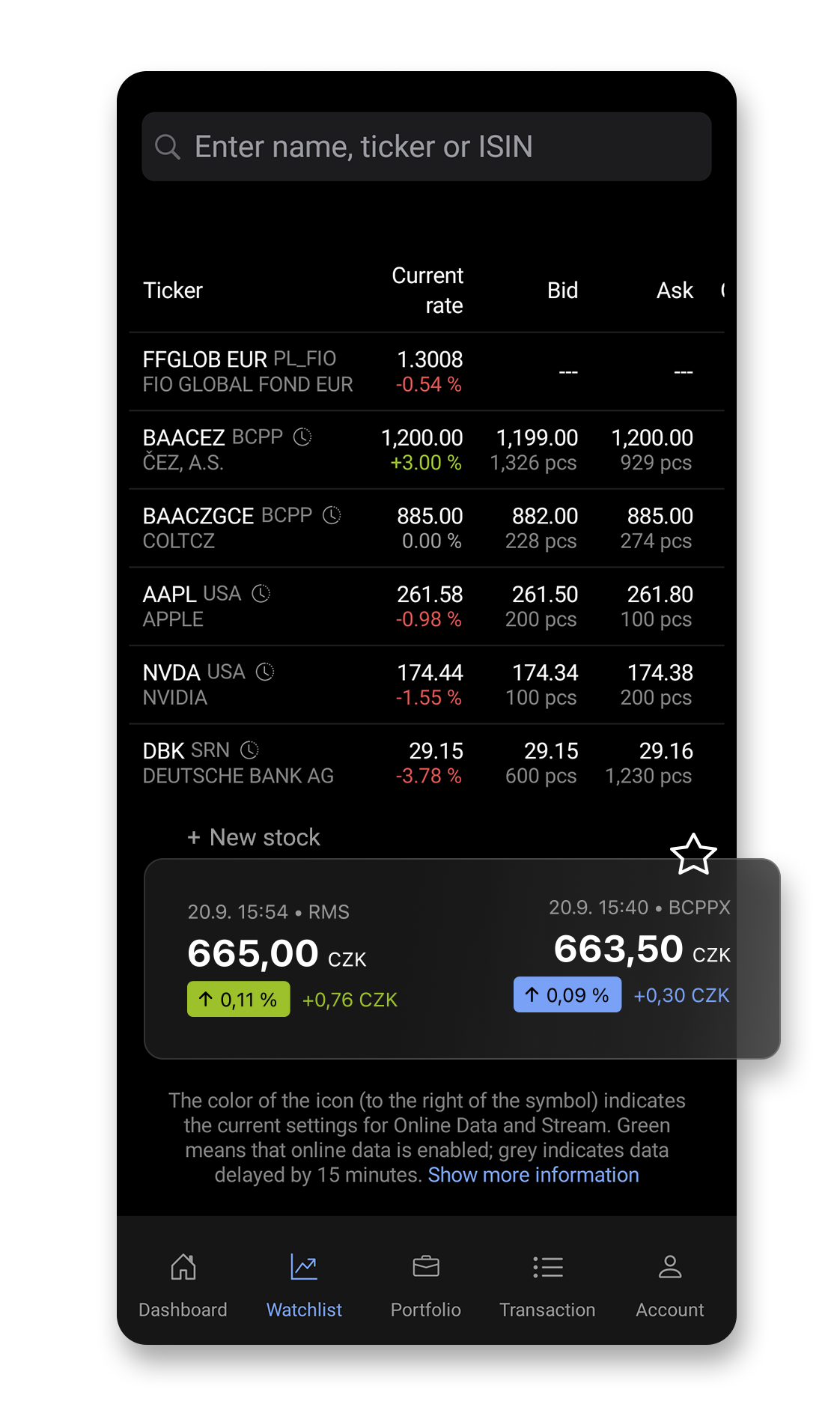 • Thanks to the application, you can monitor the market situation, search for interesting investment opportunities, and create your Watchlist.
