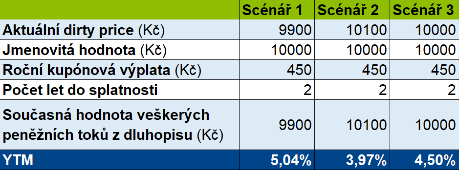 Jednotlivé výpočty si budeme ilustrovat na příkladu dluhopisu s jmenovitou hodnotou 10.000 Kč a ročním kupónem 450 Kč. Namodelujeme si dvě situace, kdy v prvním scénáři jeho cena bude činit 9.900 Kč a v druhém scénáři 10.100 Kč.
