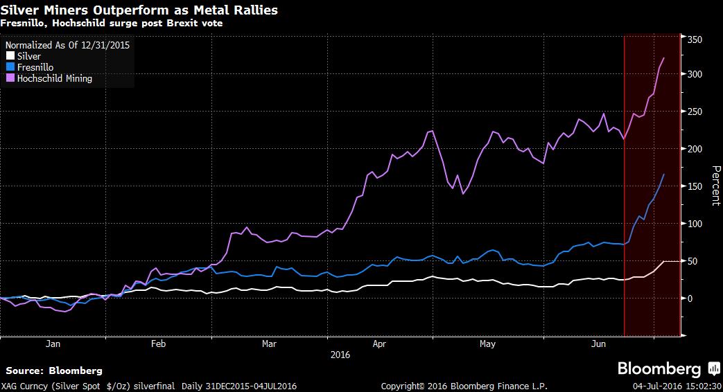 Z růstu cen zlata a stříbra těží rovněž těžaři těchto drahých kovů, jejichž akcie jen za letošní rok v mnoha případech posílily, někdy až o stovky procent. Mezi příběhy se šťastným koncem lze jednoznačně zařadit akcie společností Fresnillo a Hochschild Mining, které od začátku posílily ještě výrazněji než stříbro samotné (viz následující graf, červená čára označuje výsledky referenda o Brexitu).
