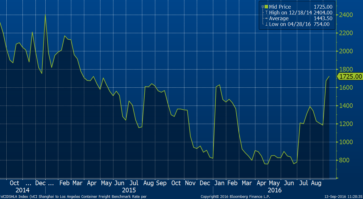 Cena kontejnerové dopravy na lince Šangaj – Los Angeles se je na ročních maximech.