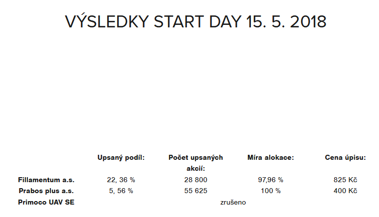 Společnosti Prabos a Fillamentum úspěšně vstoupily na trh START Burzy cenných papírů Praha. Společnost Primoco UAV dnes realizovat emisi na trhu START nebude. Výrobce strun pro 3D tisk Fillamentum vstupuje na trh START s úpisem celkem 28 800 kusů akcií při ceně 825 Kč za kus. Firma uspokojila celkem 45 objednávek investorů. Jak upozorňuje sama pražská burza, poptávka po akciích společnosti Fillamentum převýšila maximální nabízené množství 1,021x.