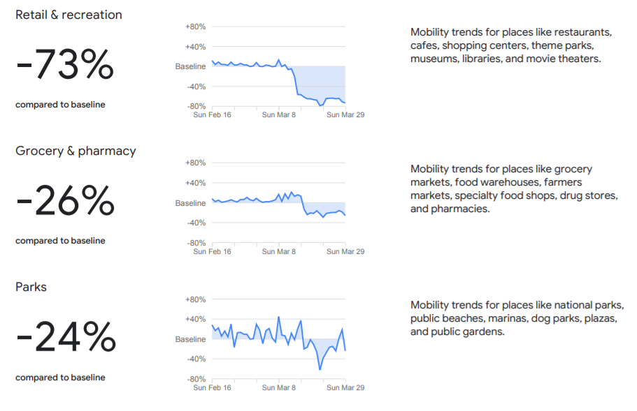 Reporty popisují vývoj návštěvnosti a doby setrvání na různých místech a porovnány s normálním stavem před vyhlášením pandemie koronaviru. Google se tímto krokem snaží pomoci státním autoritám a veřejnosti dostat se k informacím o tom, jak jednotlivé komunity přistupují k doporučením a nařízením na zdržování se společenského kontaktu pro zpomalení přenosu koronaviru SARS-CoV-2.