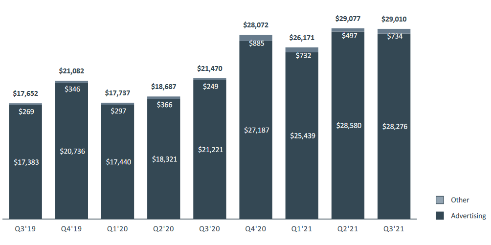 Třetinový meziroční růst reklamních výnosů na 28,3 mld. USD (97,6 % celkových výnosů) i v tomto čtvrtletí nadále podporuje důležitost přítomnosti reklam pro ziskovost společnosti, avšak v aktuálním čtvrtletí mírně pod analytickým konsensem 28,99 mld. USD. Čistý zisk Facebooku za posledních devět měsíců činí 29 mld. USD, když čistý zisk v 9M za rok 2020 činil v porovnání 17,9 mld. USD.