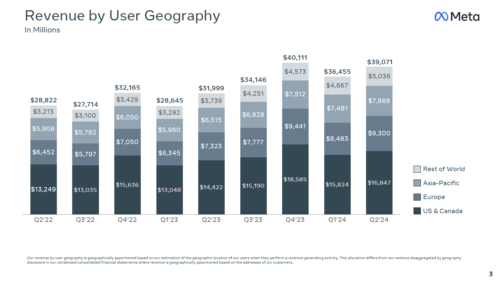 Výnosy Mety vzrostly o 22 % na 39,07 mld. USD, ze kterých drtivou většinu 38,72 mld. USD (očekávání: 37,76 mld. USD) činí výnosy segmentu „Family of Apps“, tedy reklamní výnosy plynoucí ze sociálních sítí Facebook, Instagram a aplikací Messenger a WhatsApp. Tento segment dosáhnul meziročně o 47 % vyššího provozního zisku 19,34 mld. USD při očekávání 18,69 mld. USD. Počet zobrazených reklam a jejich cena vzrostla meziročně o shodných 10 %, zatímco analytici čekali 13 %, respektive +6 %. Počet denních aktivních uživatelů se meziročně zvýšil o 7 % a průměr za červen dosáhl 3,27 miliard.