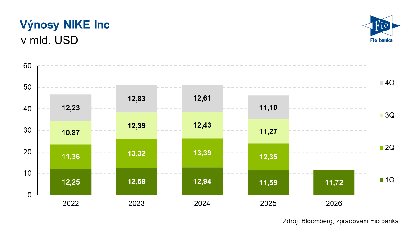 Výrobce sportovního oblečení Nike reportoval výsledky za 1Q fiskálního roku 2026. Společnost překonala očekávání na úrovni tržeb. Dle analytiků výsledky společnosti ukazují, že její snaha se zaměřit na inovace produktů a sport přináší výsledky. Během konferenčního hovoru společnost informovala, že nyní očekává negativní dopad cel ve výši 1,5 mld. USD. Dříve predikovala 1,0 mld. USD.
