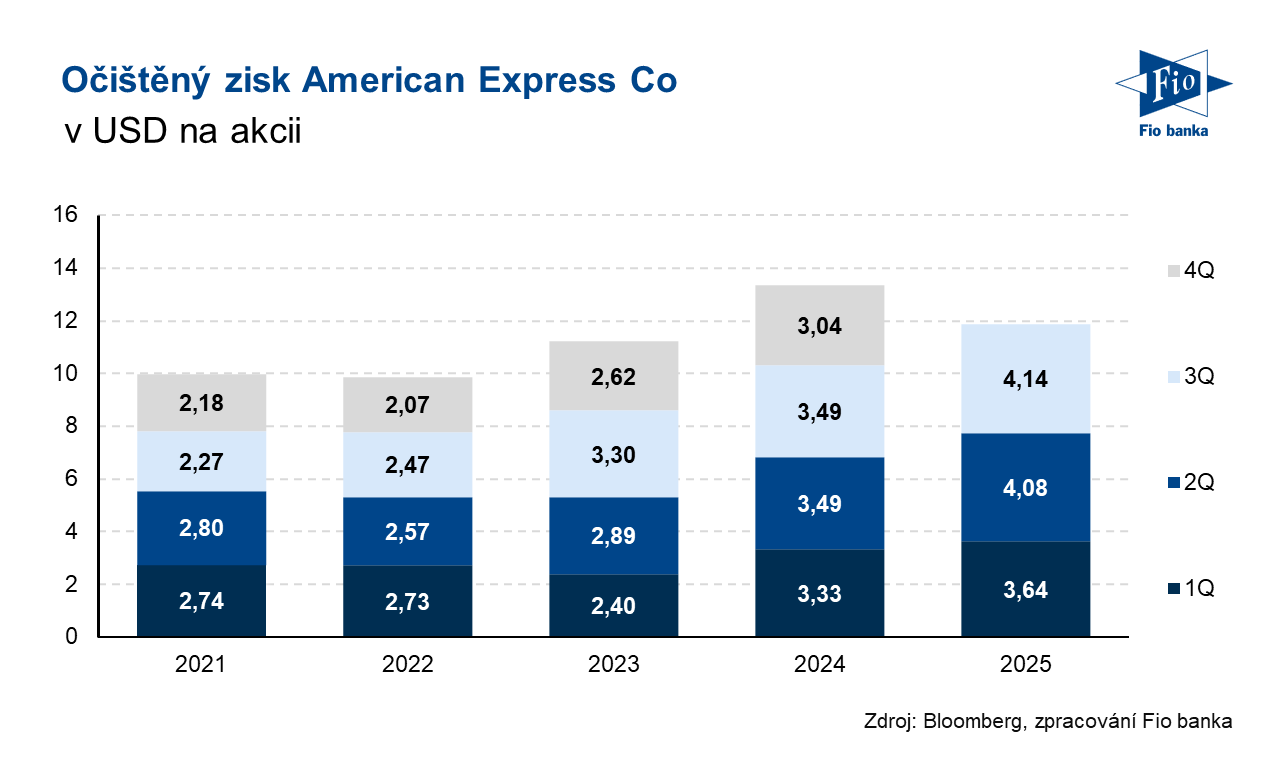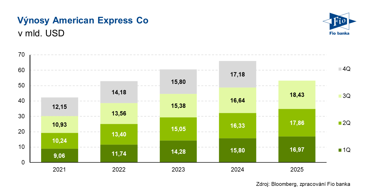 Americká finanční společnost American Express zveřejnila výsledky hospodaření za 3. kvartál 2025. Jak výnosy, které meziročně vzrostly o 11 % na 18,43 mld. USD, tak očištěný zisk na akcii 4,14 USD byly nad očekáváním analytiků. Společnost zároveň zúžila svůj roční výhled pro výnosy a očištěný zisk na akcii.