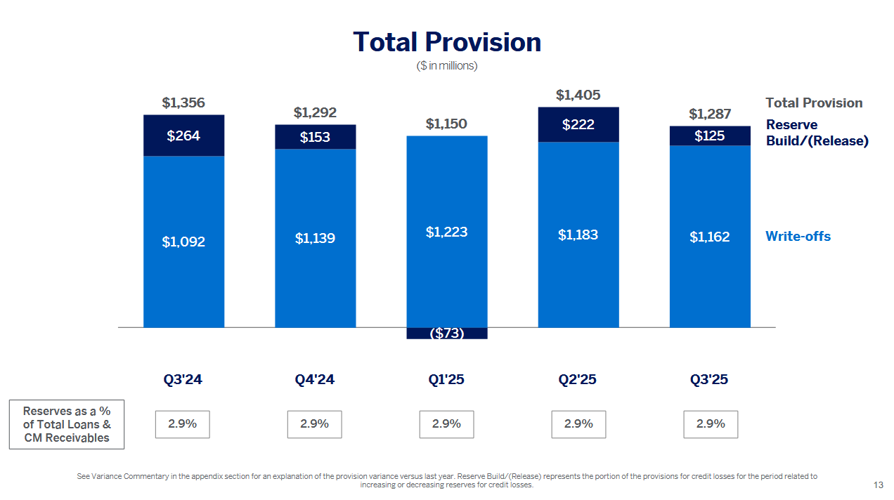 Výnosy za 3. kvartál meziročně vzrostly o 11 % na 18,43 mld. USD. Nárůst byl primárně tažen zvýšenou útratou držitelů karet, vyšším čistým úrokovým výnosem podpořeným růstem zůstatků revolvingových úvěrů a pokračujícím silným růstem poplatků za karty.
