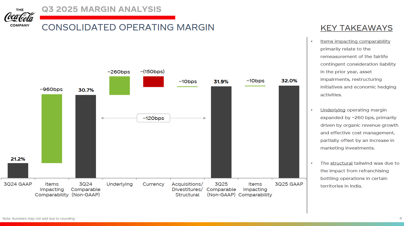 Podle analytičky Andrey Teixeira z JPMorgan organický růst tržeb o 6 % ve 3Q navazuje na +5 % ve 2Q a +6 % v 1Q, a měl by tak zůstat jedním z nejvyšších mezi výrobci spotřebního zboží v této výsledkové sezóně. To pode ní potvrzuje, že Coca-Cola patří mezi málo defenzivních titulů, které dokážou přinášet stálý, složený růst, jaký investoři ve spotřebitelském sektoru hledají.