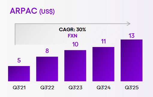 Měsíční průměrný výnos na aktivního zákazníka (ARPAC) poprvé překročil hranici 13 USD a dosáhl ve 3Q 13,4 USD, což představuje 20% meziroční růst.