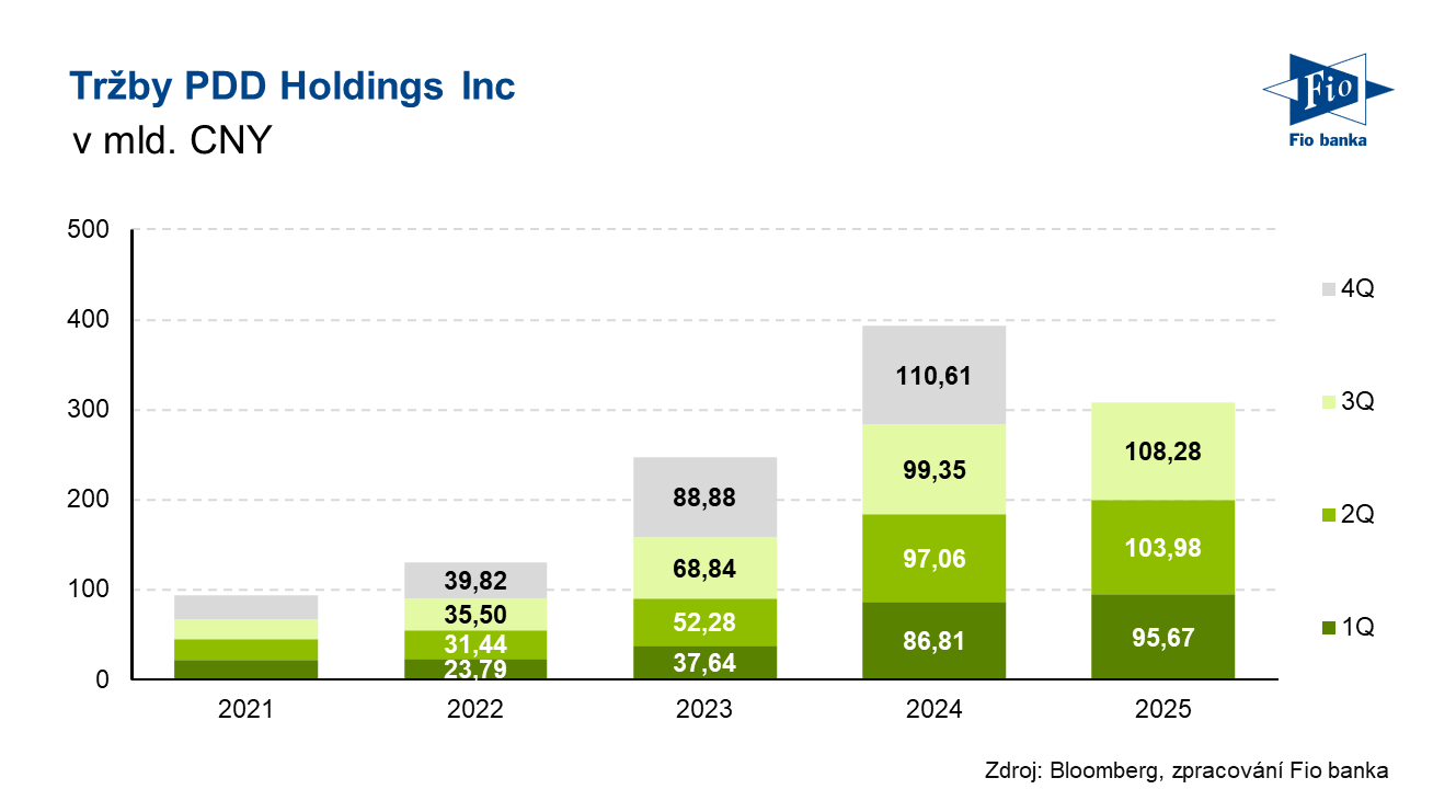 Čínská e-commerce společnost PDD Holdings, která mimo jiné provozuje online tržiště Temu, zveřejnila výsledky hospodaření za třetí kvartál roku 2025. Tržby byly za tento kvartál v souladu s očekáváním analytiků a vzrostly meziročně o 9 %. Viceprezidentka pro finance Jun Liu uvedla, že růst tržeb ve 3Q nadále zpomaloval kvůli vývoji konkurenčního prostředí a vnějším nejistotám.