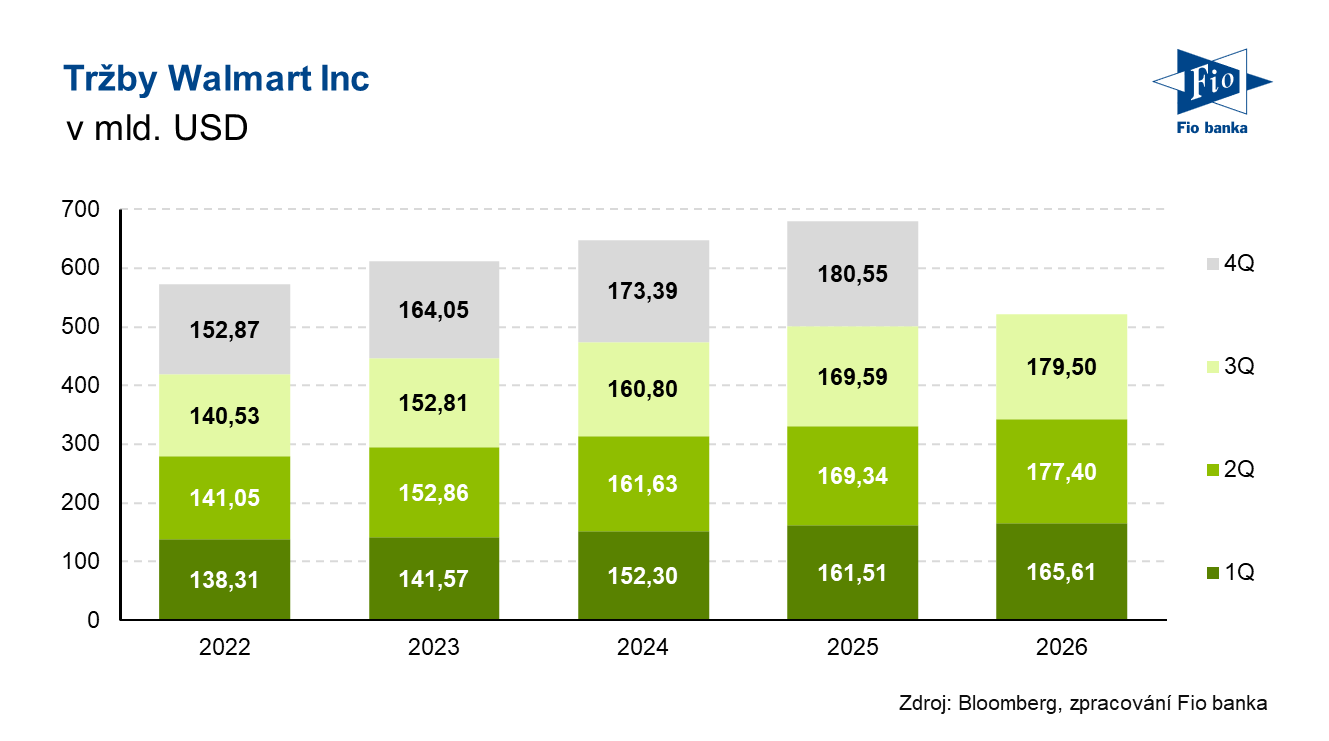 Tržby společnosti Walmart zaznamenaly meziroční růst o 5,8 % na 179,50 mld. USD při očekávání 177,57 mld. USD. Na konstantní měnové bázi pak tržby vzrostly meziročně o 6 %.