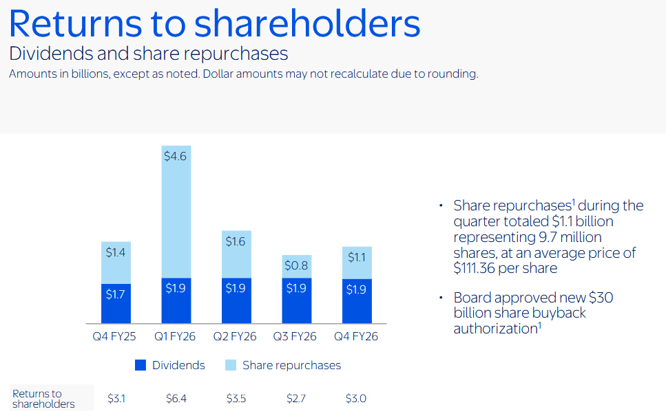 Walmart v průběhu kvartálu navrátil akcionářům 3 mld. USD, z toho 1,9 mld. USD ve formě dividend a 1,1 mld. USD ve formě zpětných odkupů akcií.