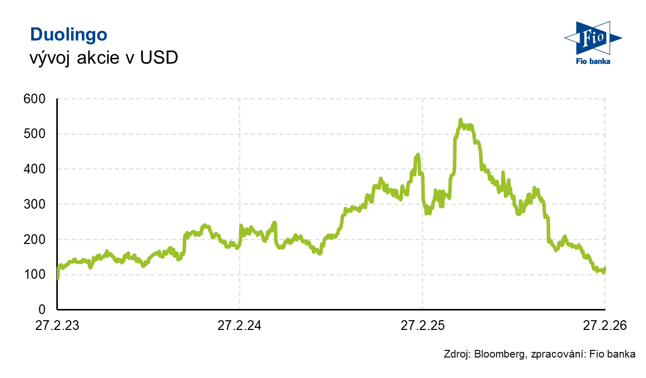 Jazyková platforma Duolingo zveřejnila výsledky za 4Q a poskytla výhled na rok 2026, který podle analytiků zaostal za očekáváním trhu. Společnost upozornila, že se více zaměří na růst uživatelské báze na bezplatné úrovni, což má krátkodobě tlumit finanční dynamiku. Akcie zažívají od začátku roku dvouciferný pokles, investoři se obávají dopadů z rozvoje umělé inteligence.