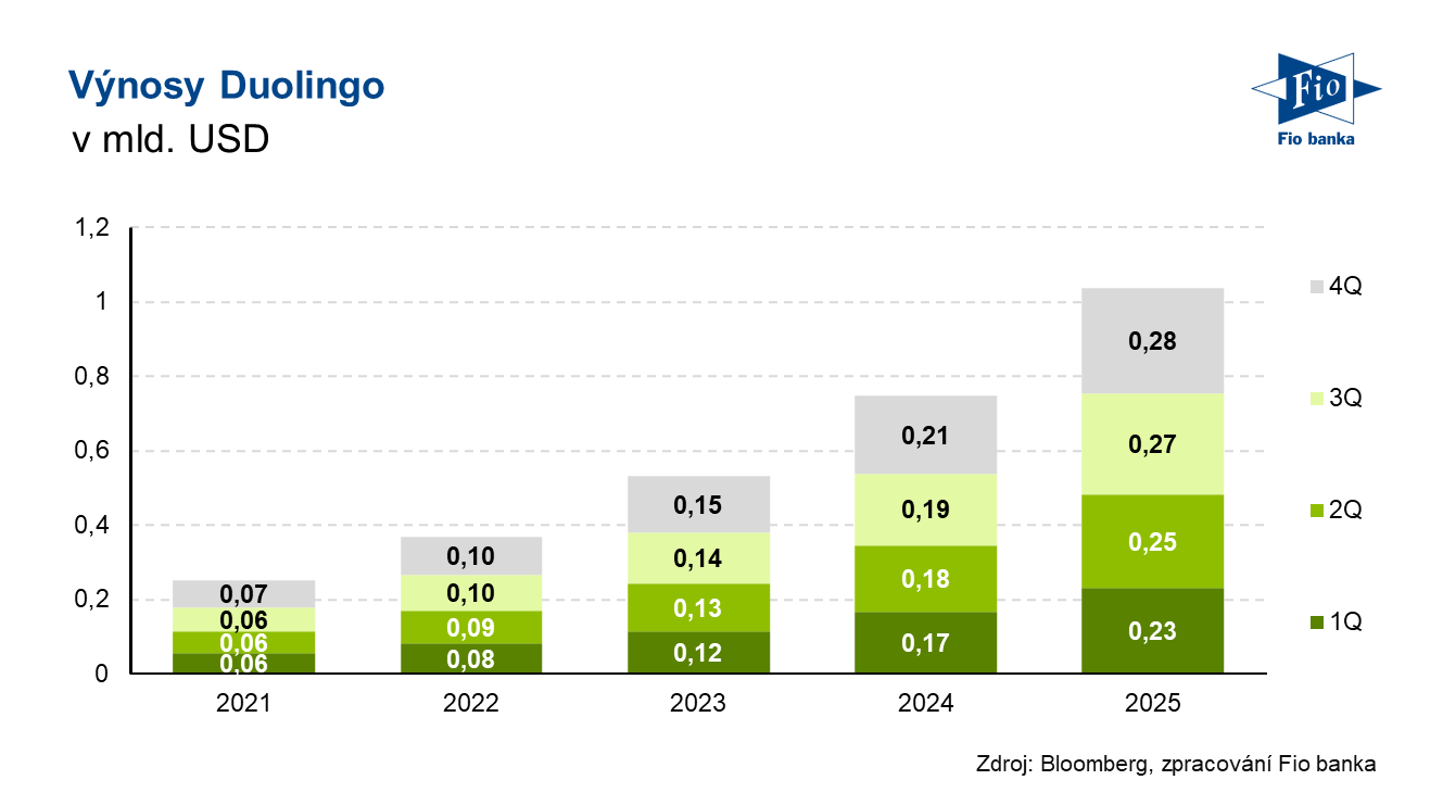 Duolingo projektuje roční výnosy v rozmezí 1,20 až 1,22 mld. USD, zatímco analytický konsensus činil 1,26 mld. USD.
