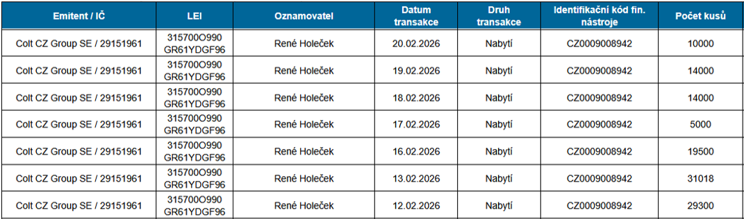 Manažerské obchody se v únoru uskutečnily pouze v Colt CZ Group.