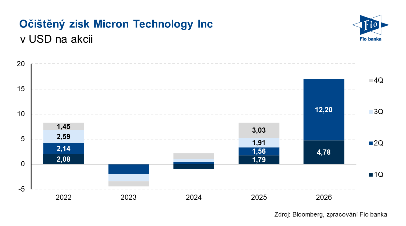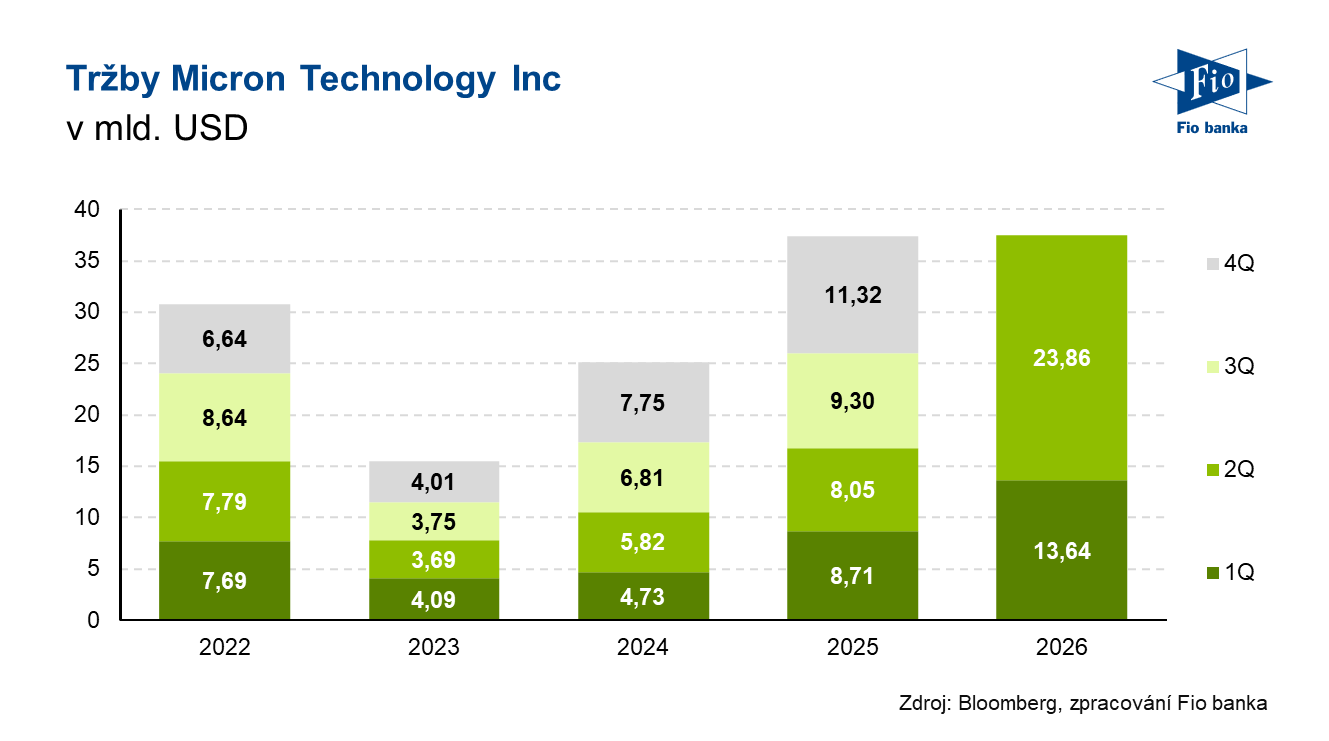 Americký výrobce paměťových čipů Micron Technology reportoval výsledky hospodaření za druhý kvartál fiskálního roku 2026, který skončil 26. února. Výsledky i výhled předčily veškerá očekávání. Tržby se meziročně téměř ztrojnásobily a očištěná hrubá marže zaznamenala meziroční růst o 37 p. b. Aby společnost dokázala uspokojit bezprecedentní poptávku, plánuje masivní kapitálové výdaje spojené s výstavbou nových továren. Analytici se zaměřili na obavy ohledně udržitelnosti takto vysoké hrubé marže.