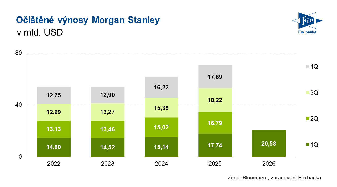 Americká investiční banka Morgan Stanley reportovala výsledky hospodaření za první kvartál roku 2026. Čisté výnosy meziročně vzrostly o 16,2 % na 20,58 mld. USD a překonaly očekávání analytiků ve výši 19,71 mld. USD.