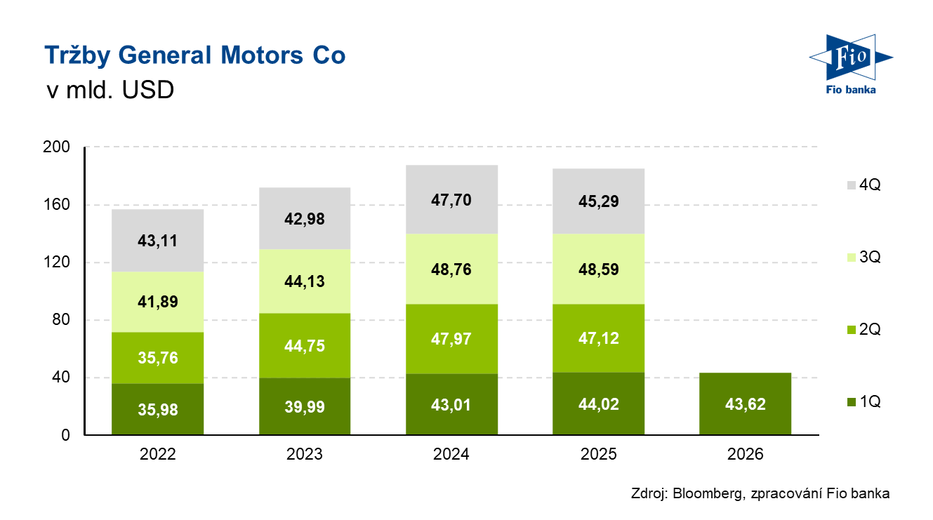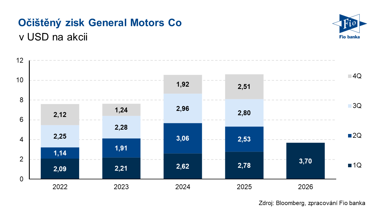 General Motors odůvodnila zvýšení výhledu pro fiskální rok 2026 nižšími celními náklady ve výši 0,5 mld. USD. Automobilka očekává, že silné výsledky za 1Q vykompenzují dodatečné náklady na komodity a přepravu.