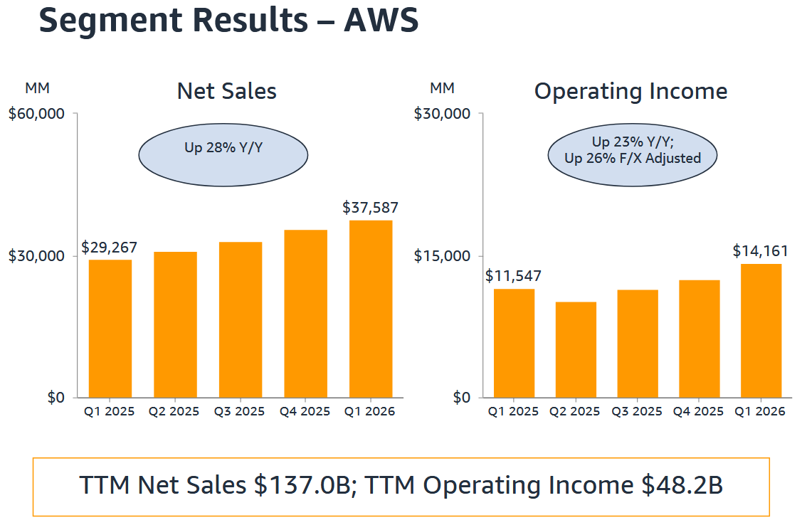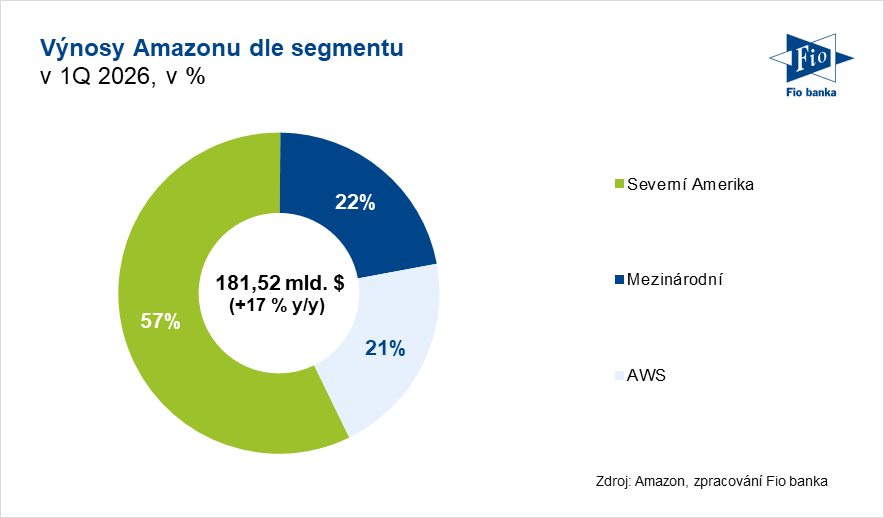 AWS překonalo v 1Q očekávání, když zrychlilo růst výnosů na meziročních +28 % na 37,59 mld. USD. Trh očekával růst o +25,7 %. Provozní zisk tohoto segmentu dosáhl 14,16 mld. USD (1Q 2025: 11,55 mld. USD) a tvořil více než 59 % provozního zisku celé společnosti. Provozní marže klesla meziročně o 1,8 p. b. na 37,7 %.